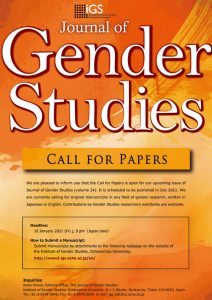 Journal of Gender Studies (volume 24). It is scheduled to be published in July 2021. We are currently calling for original manuscripts in any field of gender research, written in Japanese or English. Contributions by Gender Studies researchers worldwide are welcome.