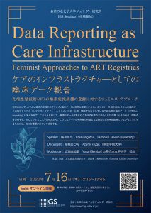 | 《Details》 【Date/Time】July 16, 2020, 12:15–13:45 (JST)/11:15–12:45 (CST) 【Venue】Online (Zoom Webiner) 【Presenter】 Chia-Ling WU (Professor, National Taiwan University) Presentation title: “Data Reporting as Care Infrastructure: Feminist Approaches to ART Registries” 【Discussant】Azumi TSUGE (Professor, Meiji Gakuin University) 【Moderator】Yukari SEMBA (Project Research Fellow, IGS, Ochanomizu University) 【Language】English (Consecutive interpreting in Japanese) 【Number of Attendatees】64 【Event Information】https://www2.igs.ocha.ac.jp/en/events/2020/07/0716/ |